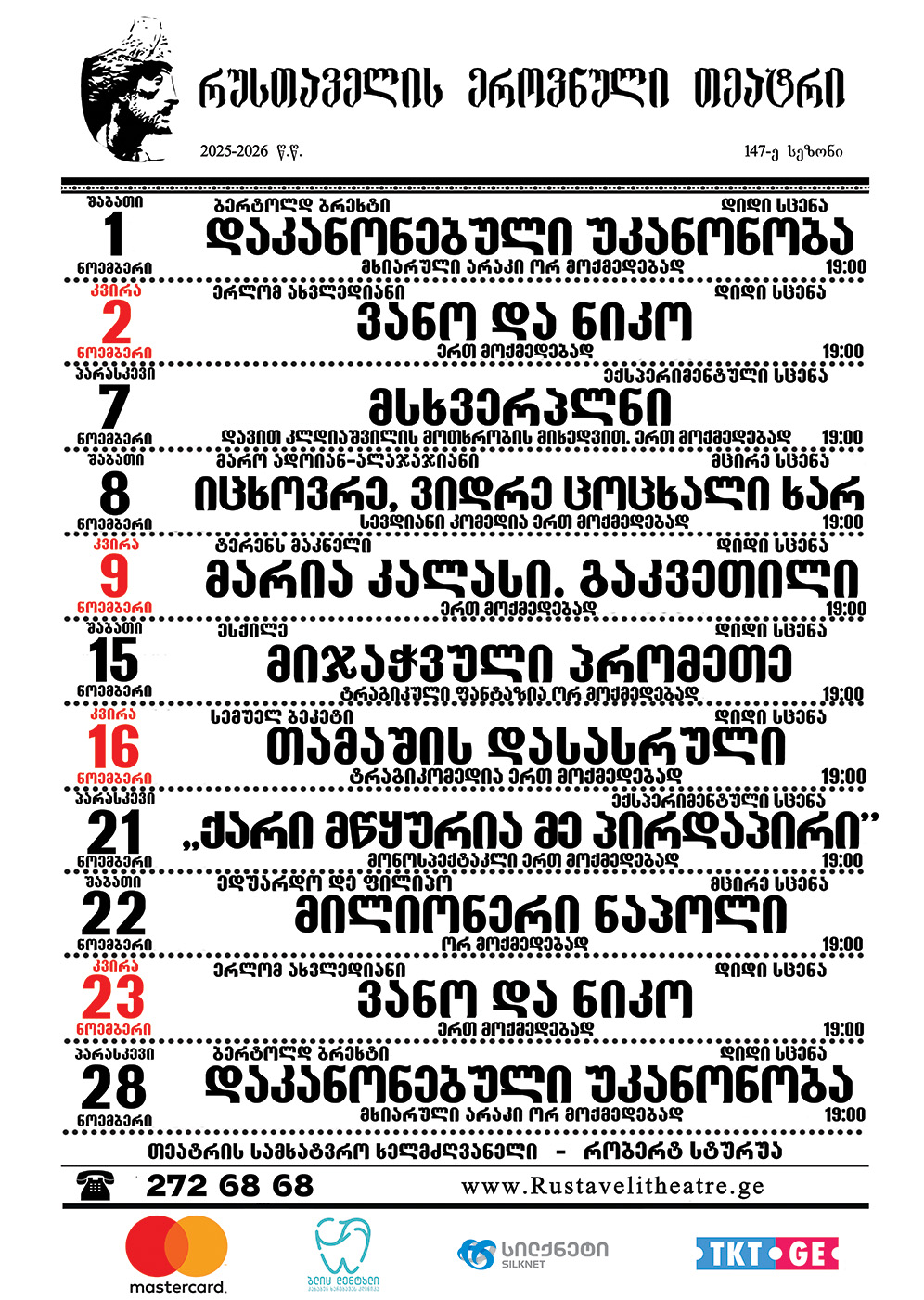 10 მაისს დანიშნული სპექტაკლი ``ჰედა გაბლერი” მოიხსნა მსახიობის ავადმყოფობის გამო. რუსთაველის ეროვნული თეატრის სალაროში შეძენილი ბილეთები შეგიძლიათ დააბრუნოთ, ხოლო tkt.ge - ზე შეძენილი ბილეთების თანხა ავტომატურად დაგიბრუნდებათ ანგარიშზე. დამატებითი ინფორმაციისათვის:👇 📞2726868 📨 Email: info@rustavelitheatre.ge მისამართი: რუსთაველის გამზირი N17